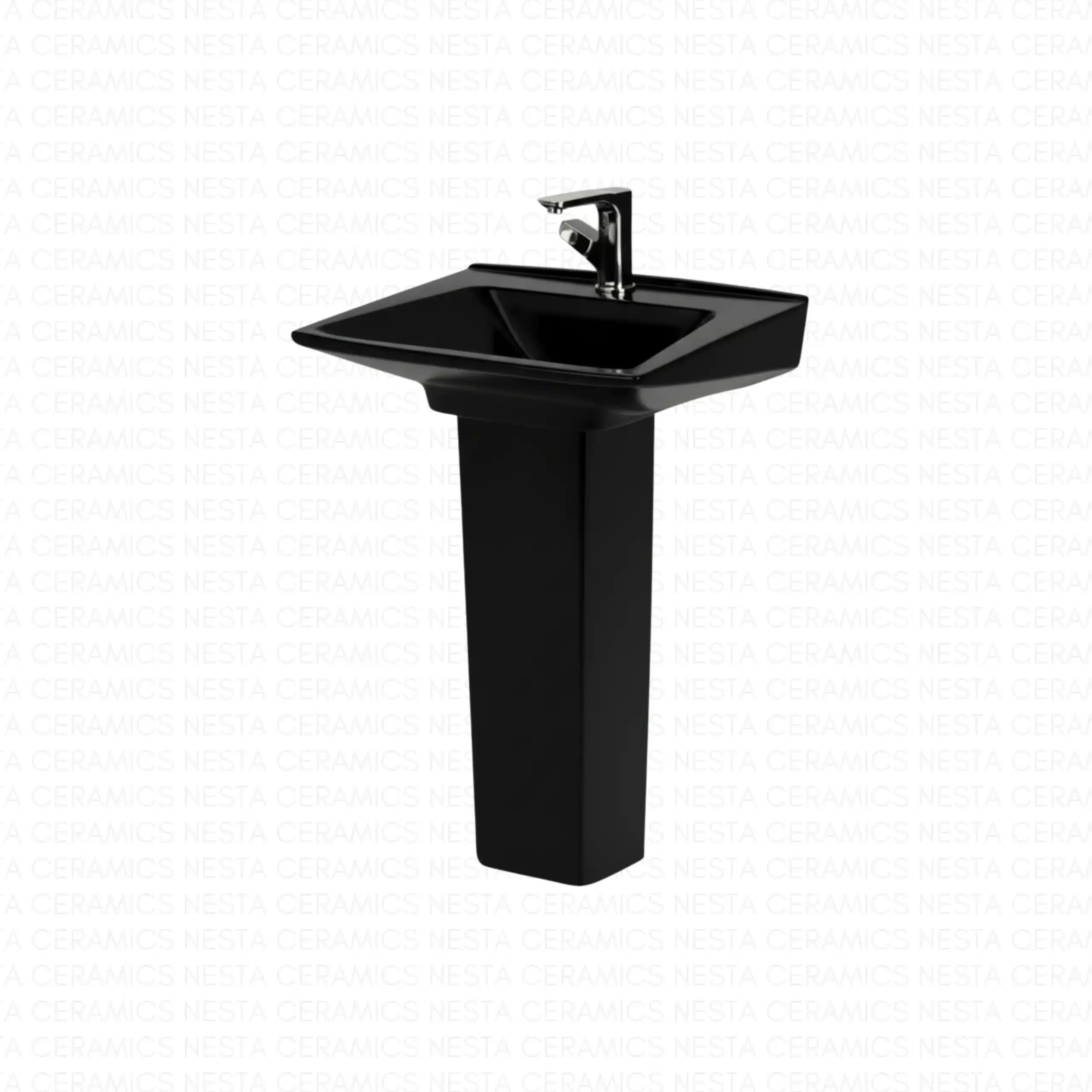 The Monolith is a modern pedestal basin featuring a sharp rectangular form, precision-tapered bowl, and high-gloss nano-glazed ceramic finish, designed for compact spaces that demand bold architectural presence.